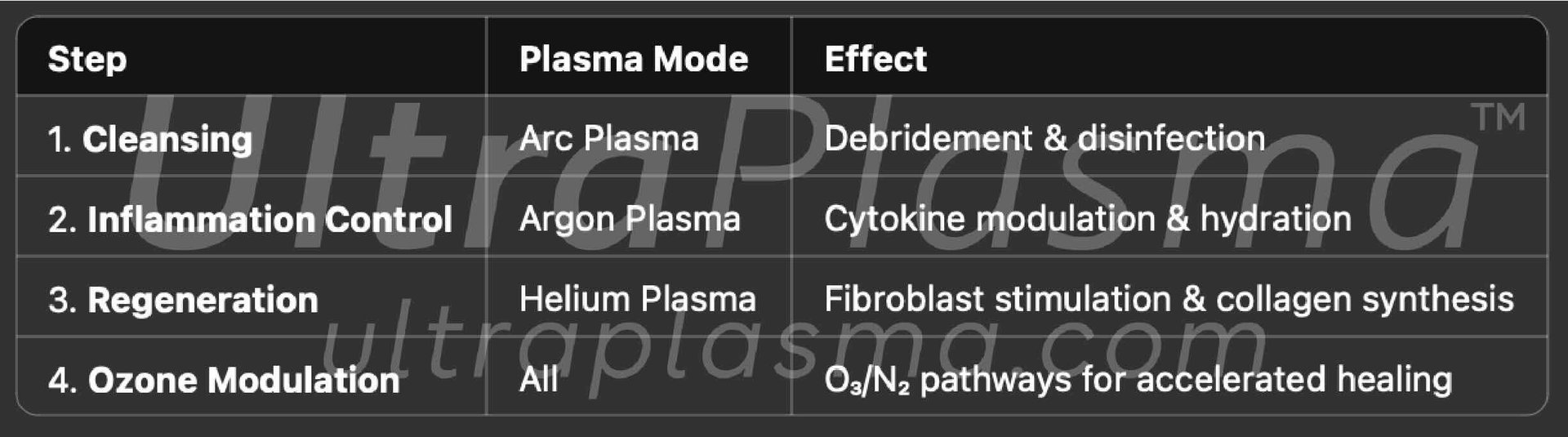 UltraPlasma™ argon plasma mode: Mid-penetration, anti-inflammatory, oxygenation-promoting.