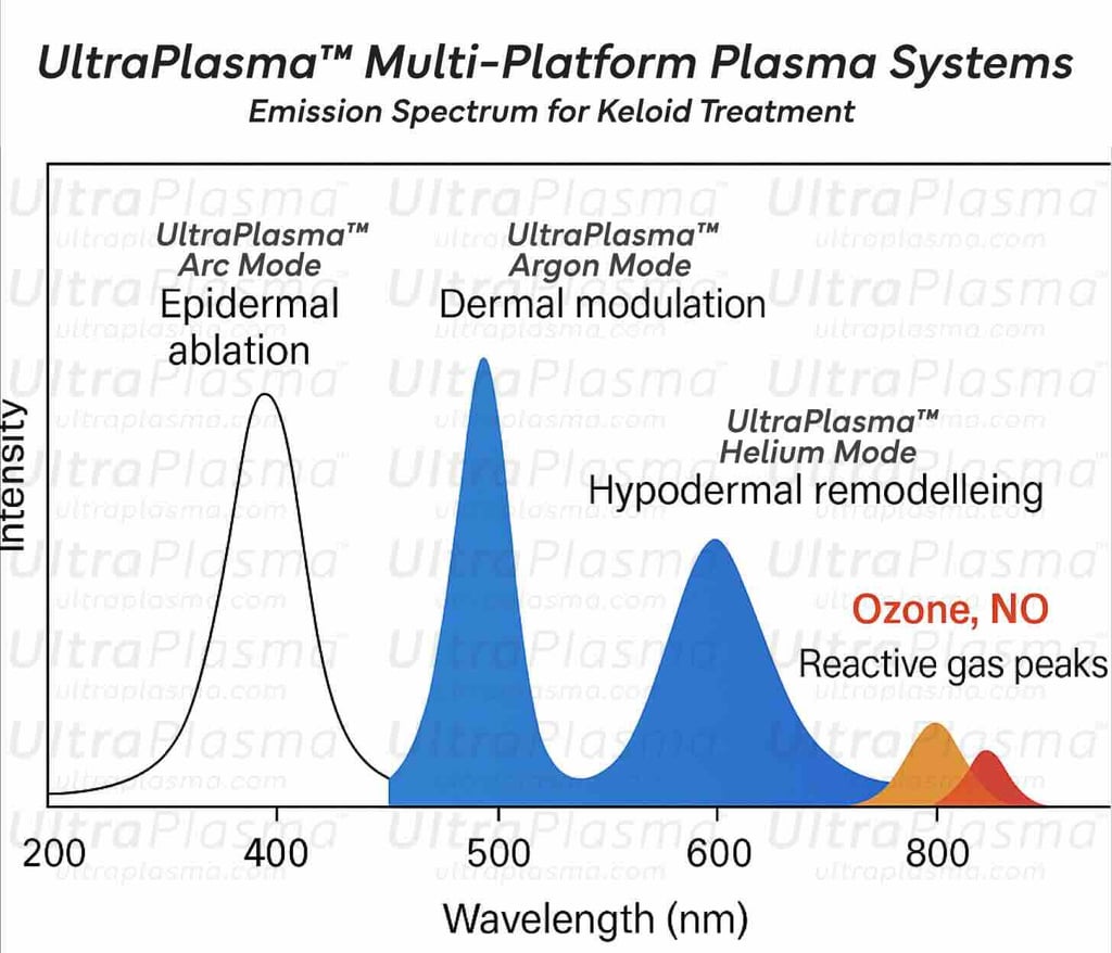 Keloids represent a pathological form of dermal fibrosis resulting from aberrant wound healing. Characterized by excessive collagen deposition extending beyond the original wound margins, they are resistant to conventional treatments. This paper investigates the anatomical pathology of keloids and details a novel approach for their treatment using the UltraPlasma™ multi-platform system integrating arc, argon, and helium plasma technologies. Emphasis is placed on the role of plasma-generated reactive oxygen and nitrogen species (RONS), including ozone (O₃), nitric oxide (NO), superoxide anion (O₂•⁻), hydroxyl radical (•OH), hydrogen peroxide (H₂O₂), nitrogen dioxide (NO₂•), peroxynitrite (ONOO⁻), and organic radicals in modulating fibroblast activity, angiogenesis, and extracellular matrix (ECM) remodeling. Anatomical targets within the epidermis, dermis, and hypodermis are delineated, and figures illustrate energy delivery, biochemical cascades, and clinical progression.