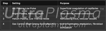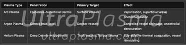 Each plasma type can be adjusted in output parameters (voltage, frequency, pulse width) and gas ratios, enabling selective targeting of superficial and deep dermal blood vessels.