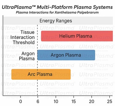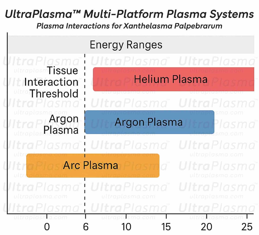 Xanthelasma Palpebrarum (XP) is a common periorbital condition characterized by yellowish cholesterol-rich plaques on the eyelids. Traditional removal methods include excision, chemical peels, cryotherapy, and lasers, often with recurrence or adverse effects. This article presents a novel, minimally invasive approach using the UltraPlasma™ multi-platform plasma system, which integrates arc, argon, and helium plasma technologies. These modalities target specific skin layers (epidermis, dermis, hypodermis) and employ reactive gas interactions (ozone, nitric oxide, reactive oxygen/nitrogen species) to remodel tissue, reduce lipid accumulations, and stimulate regeneration. The article includes anatomical analysis, plasma-tissue interaction engineering, treatment mechanisms, and clinical figure illustrations.